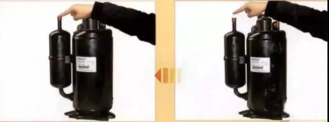 首先,將壓縮機卸下, 加電使其運轉,用手指堵住壓縮機的排氣孔片刻, 再將手指移開。 由于壓縮機內有壓力, 所以當用手堵住壓縮機的排氣孔時, 應感到有排氣壓力;當把手指移開時, 可以聽到 “呲呲的排氣聲, 而且排氣壓力正常的壓縮機,應很難堵住壓縮機排除的氣體,這表明壓縮機性能良好。如果用手堵住排氣管時感覺不到壓力, 將手指移開時,聽不到排氣聲, 則說明該壓縮機性能不良。如下圖所示: