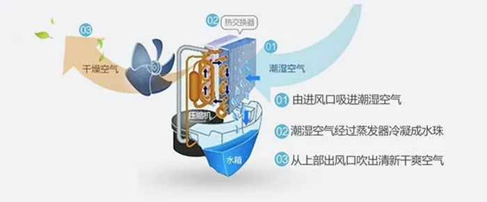 在正常開機(jī)的情況下→通過風(fēng)機(jī)的運(yùn)行→潮濕的空氣從進(jìn)風(fēng)口吸入→經(jīng)過蒸發(fā)器→蒸發(fā)器將空氣中的水附在鋁片上→變成干燥的空氣→經(jīng)過冷凝器散熱→從出風(fēng)口吹出。