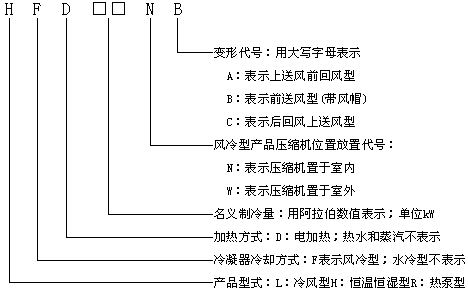 型號(hào)舉例:HF19N 表示名義制冷量為19kW的壓縮機(jī)置于室內(nèi)的風(fēng)冷型單元式空調(diào)機(jī)組。