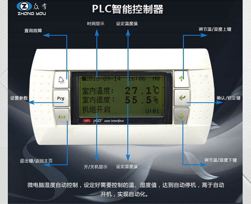1. 采用國(guó)際品牌可編程PLC控制器,獨(dú)有的微電腦智能全自動(dòng)控制系統(tǒng),用戶只要設(shè)定好所需的溫濕度控制范圍,機(jī)組即自動(dòng)判斷運(yùn)行負(fù)荷進(jìn)行能量調(diào)節(jié),按最經(jīng)濟(jì)的運(yùn)行模式自動(dòng)運(yùn)行,節(jié)約了運(yùn)行費(fèi)用;控制器預(yù)留遠(yuǎn)程控制接口,可方便用戶遠(yuǎn)程集中控制,節(jié)省管理。