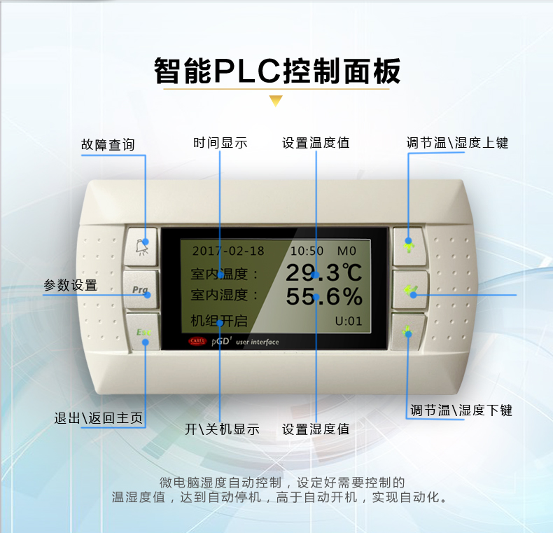 3、高性能電子電極加濕器:不滋生細(xì)菌,對(duì)室內(nèi)空氣無污染;對(duì)水質(zhì)無特殊要求,無需水處理;獨(dú)立加濕器控制板,自動(dòng)定時(shí)換水清洗,延長使用壽命,能自動(dòng)根據(jù)加濕要求控制水位及加濕電極電流,實(shí)現(xiàn)高精度控制,真正滿足高精度要求;